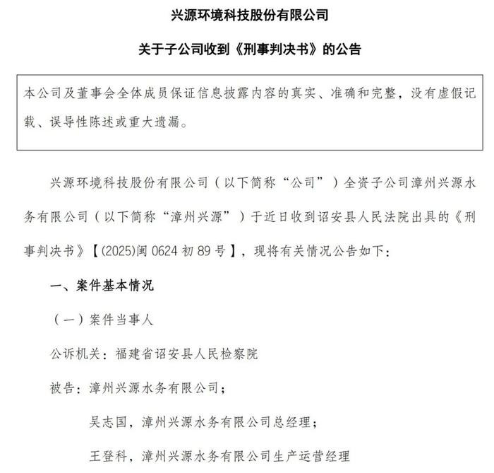 8月27日,兴源环境(300266.SZ)公告称,其全资子公司漳州兴源水务有限公司(以下简称“漳州兴源”)于近日收到诏安县人民法院出具的《刑事判决书》。