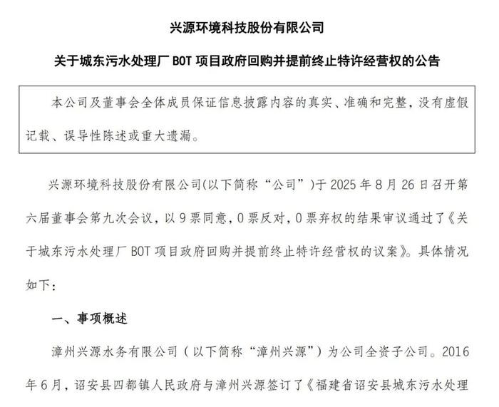 在刑事判决书曝光的同一天,兴源环境也公告了漳州兴源运营的城东污水处理厂BOT项目因客观原因,其特许经营权被政府提前回购并终止。